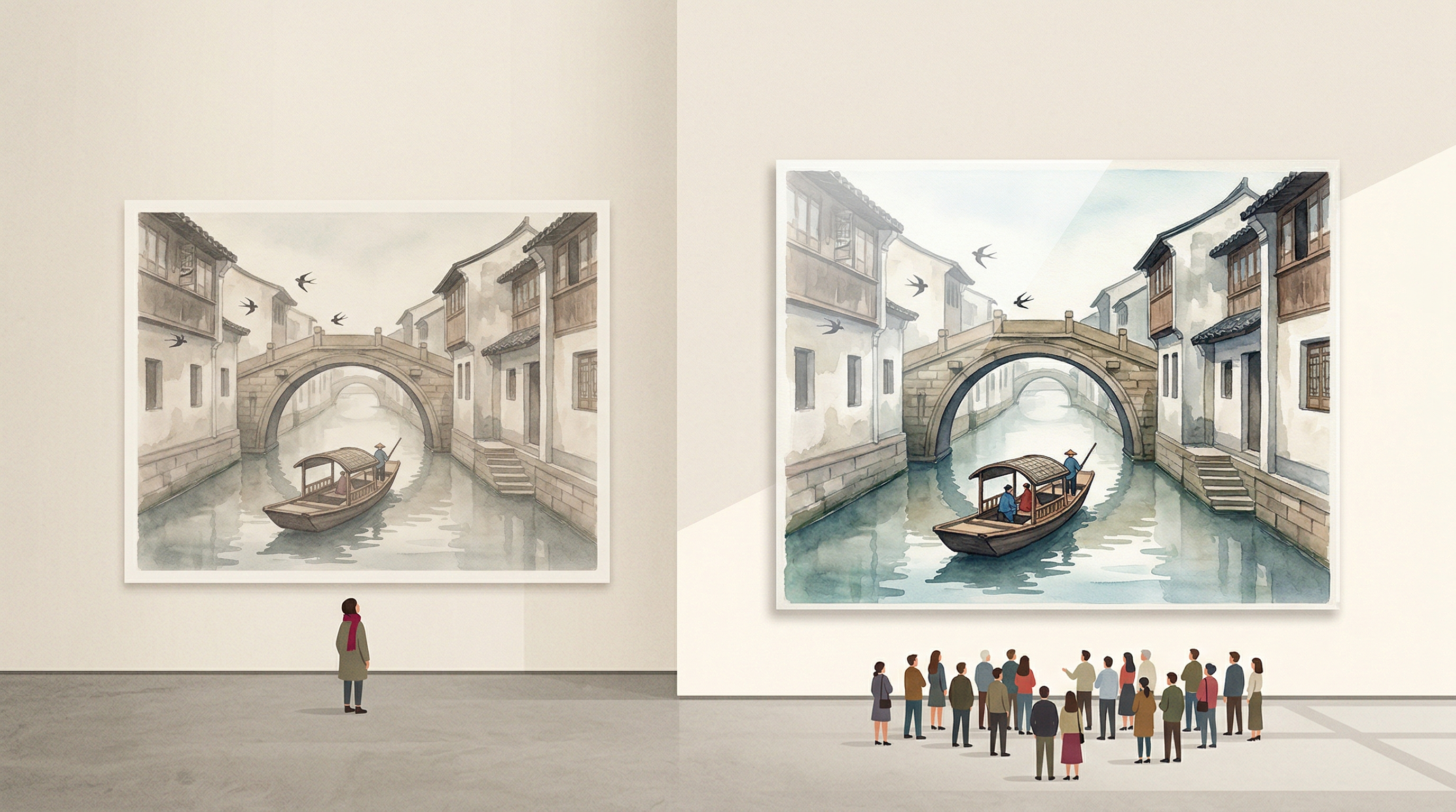 她画了一幅水彩风的江南小镇,构图挺讲究,拱桥、乌篷船、檐角的燕子,发在小红书上,三位数的赞。两周后,她刷到另一个号发了一张画,一看差点把手机摔了。构图几乎一样,桥的位置、船的位置、燕子的位置全都对得上,只是配色换成了更讨喜的莫兰迪色系,笔触更细腻一点。