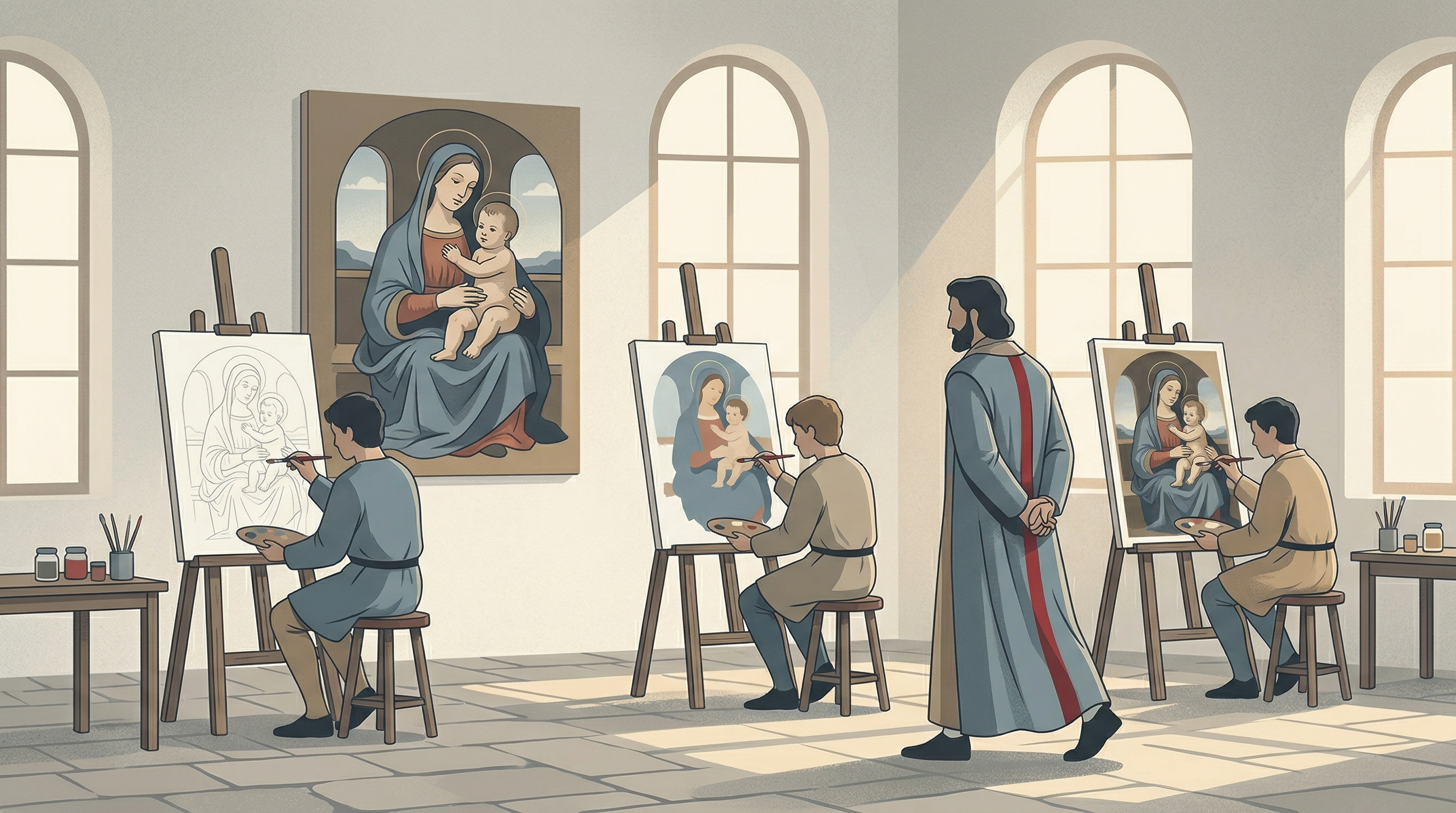真的,就是字面意义上的抄。学徒进入一个工坊,第一件事是临摹老师的画,临摹到几可乱真为止。然后老师接到一个订单,比如一幅圣母像,老师画主体,学徒们画背景、画天使、画衣服的褶皱。一幅画上挂的是老师的名字,但里面可能有七八个人的笔触。